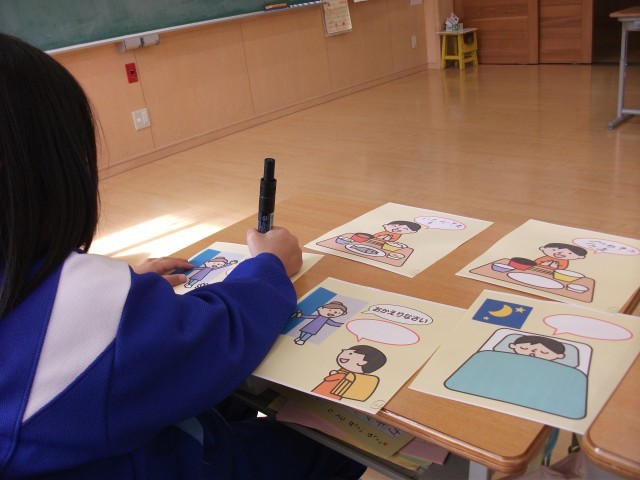 最近の挨拶の様子を振り返り、「気持ちのよいあいさつ」をするためには何が大切かを考えました。「こんなとき、どんなあいさつ?サイコロ」をつくり、あいさつの実践練習をしました。サイコロの絵を見て、ちょうどいい大きさの声であいさつができました。