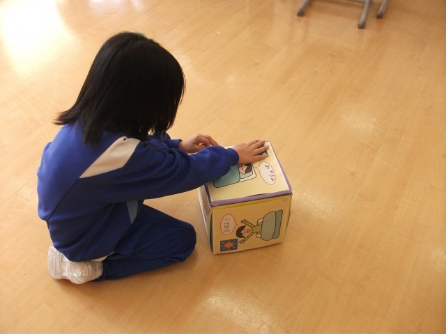 身の回りにあるいろいろな形の箱を「はこのかたち」「つつのかたち」「さいころのかたち」「ボールのかたち」に仲間分けしました。形の特徴がよく分かったところで、かたち当てクイズもしました。「円いところがあるから筒の形だな」「ちくちく(角)があるから箱の形だな」と理解しながら楽しく学習しました。