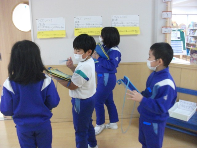 空気の学習の最終日で、テスト後に空気を集めて的当てをしたり、風船のようにとばしたりして、空気と親しみました。