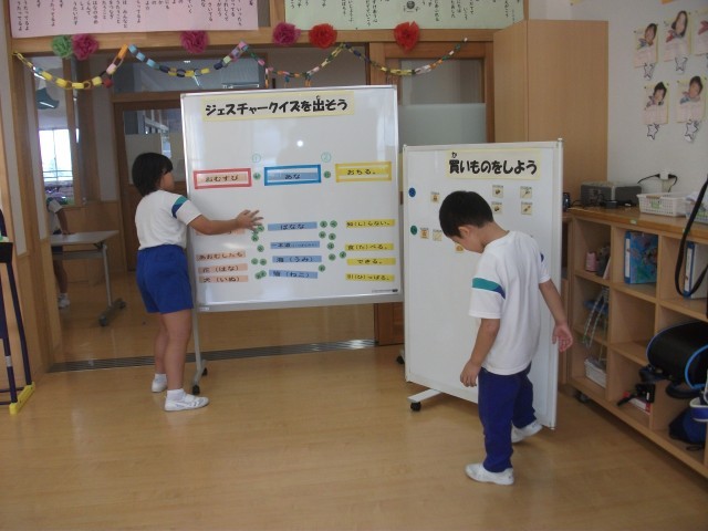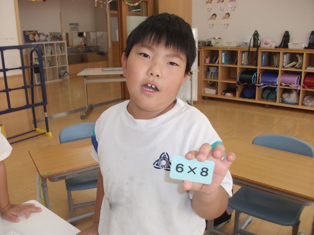 たし算やひき算、かけ算の答えの分だけこまを進める「がんばるマンすごろく」を楽しみました。太陽マークで止まったら、チャレンジカードを引いてミッションにチャレンジします。子供たちは「たくさんチャレンジしたい」という思いが強く、前回より太陽マークを増やしました。今日は、「買い物をしよう」「ジェスチャーゲームをしよう」のミッションに協力して取り組み、クリアしました。