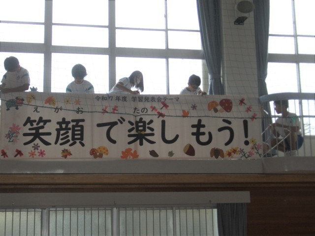 学習発表会に向けた練習の特別日課が始まりました。今日は、運営委員会によって、学習発表会テーマ「笑顔でたのしもう」がステージ横に掲げられました。「笑顔で演じることで、見ている方にも楽しんでいただけるステージにしたい」との思いを込めて、代表委員会で決定しました。どの学年も、テーマの実現に向けて、一生懸命練習に取り組んでいます。