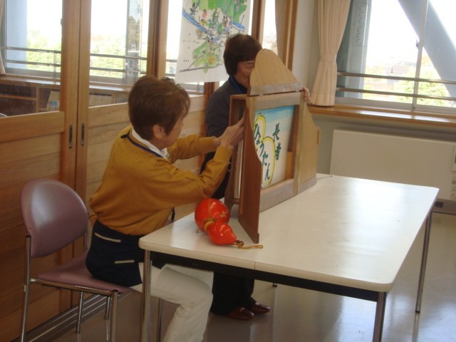 手づくりの紙芝居を温かい語りで読み聞かせをしていただいいています。