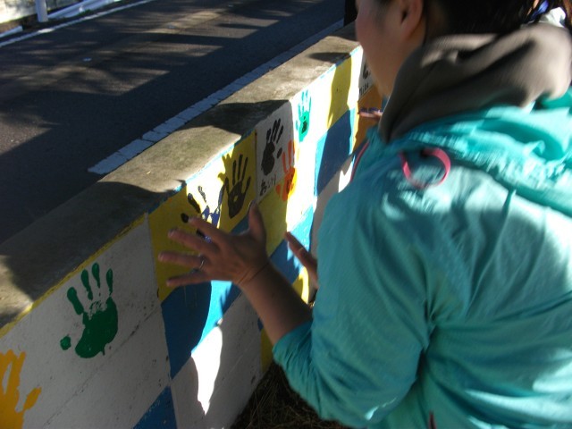 今日は庄川小学校の創校60周年をお祝いして、グラウンドのブロック塀に親子で手形アートをしました。