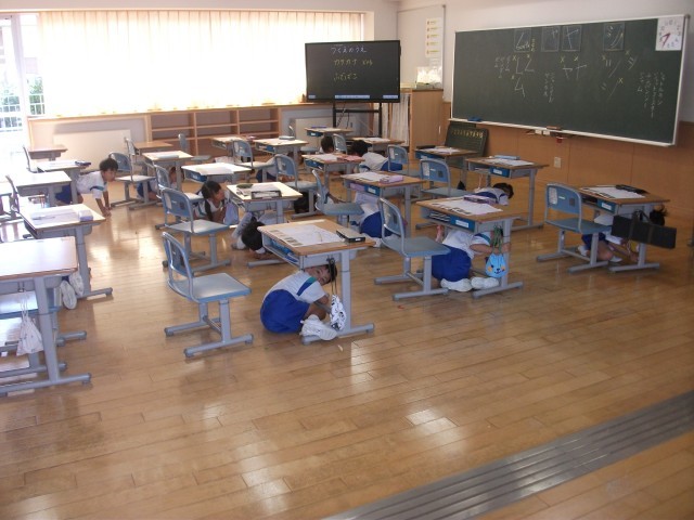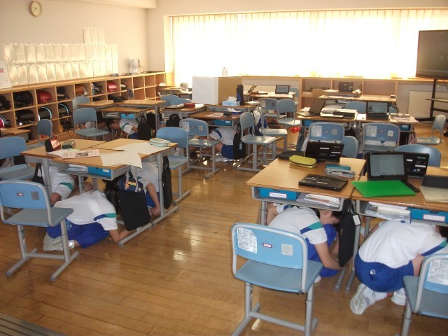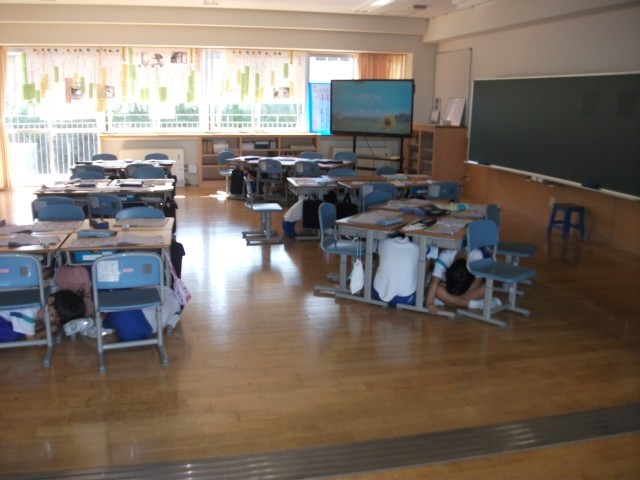 警戒アラートの音、地震の音が放送から流れました。子供たちは、机の下にもぐり、頭を守りました。