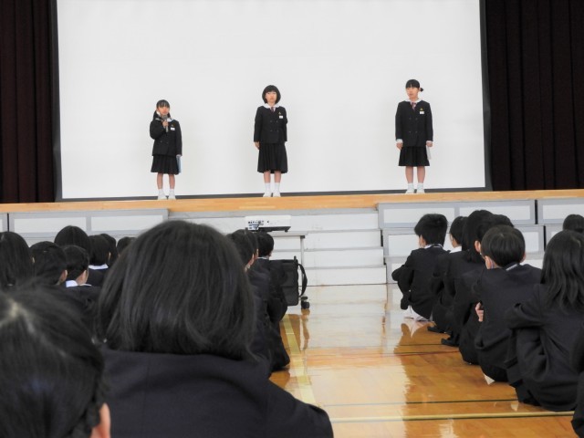 PTA会長さんから門出の言葉をいただき、6年生代表のあいさつの後、みんなで万歳三唱を行いました。5年生からは、エールが送られました。