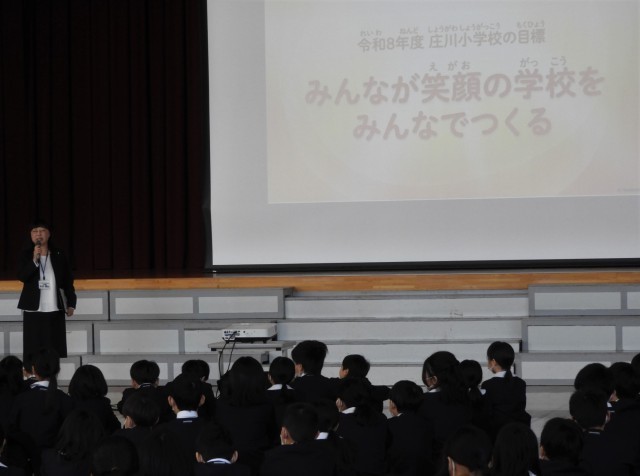 その後、校長が今年度の学校重点目標について話しました。「みんなが笑顔の学校をみんなでつくる ~太陽のようなあたたかさで~」です。庄川小学校のシンボルの「太陽」を生かし、みんなで力を合わせてがんばりましょう。