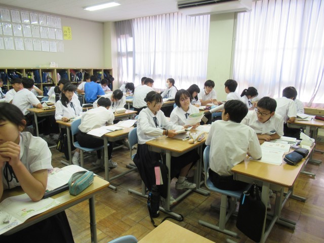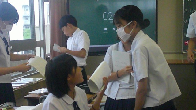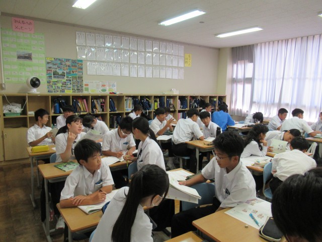 1年生が文学的教材「星の降るころに」で、学習を進めています。今日は作品の魅力を自分で考えた後、仲間と交流し、さらに作品のよさを考え深める日。自分で分析した作品の魅力と、異なる意見を仲間がもっています。豊かに読み進めた時間でした。国語の時間のよさを感じました。自由に交流し、自分の考えを深めようとする生徒の姿、いい姿です。