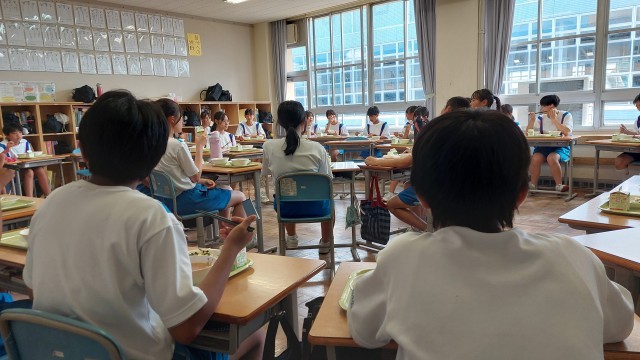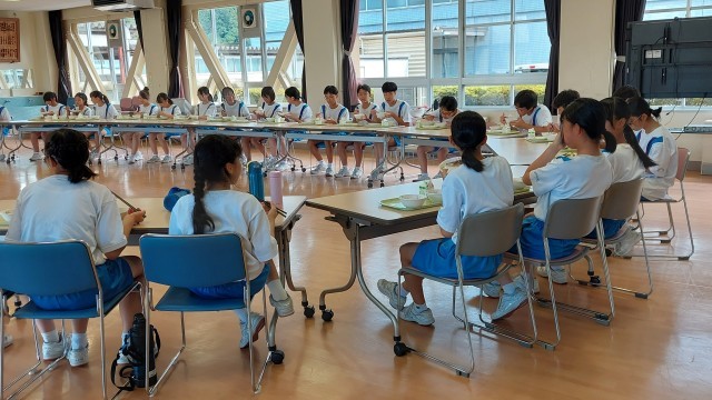いつもなら、体育大会のお昼はお弁当で元気を養いますが、今日は給食です。チームで一堂に会し、食事をしています。ある団は午後に残っている競技の綱引きで、いかに勝つか、相談していました。情熱とやる気がほとばしる楽しいランチでした。午後の戦いが楽しみです。
