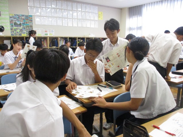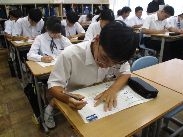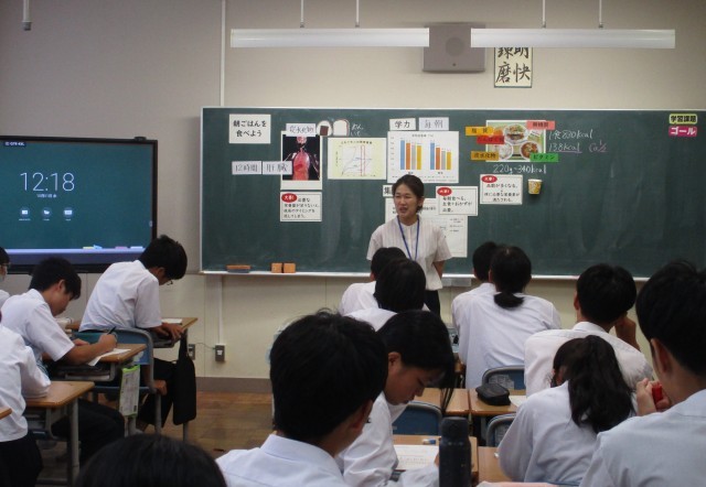 2学年では、栄養教諭による「食」に関する授業を行いました。生徒たちはワークシートに記入しながら、朝食をとることや、バランスよく食べることの大切さについて学びました。授業後には、「自分では栄養が足りていると思っていたけれど、実は不足していることが分かった」「いつも栄養バランスを考えて朝ごはんを作ってくれている家族に感謝したい」といった感想も聞かれました。