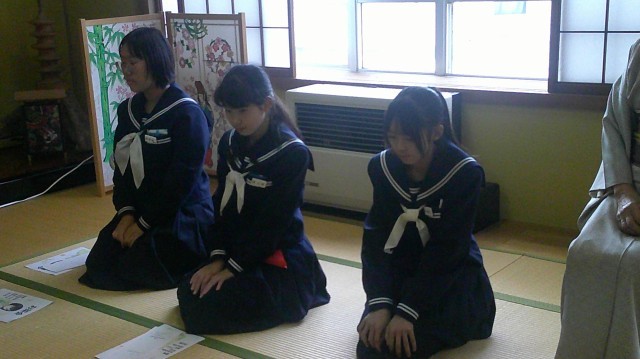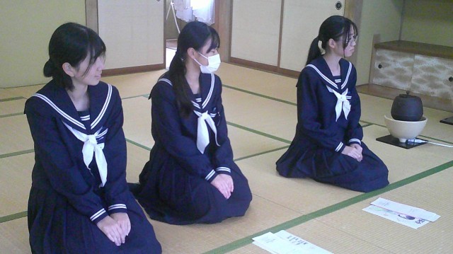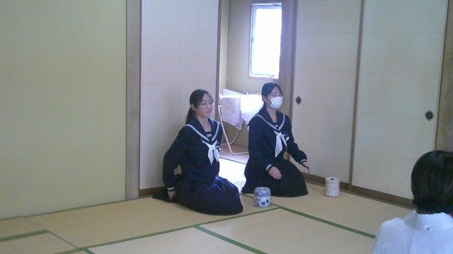 学習発表会の準備で係会をしています。特設茶道部の生徒が、茶道の先生方に指南していただき、お茶をたてる、運ぶ、いただく、などの稽古をしています。