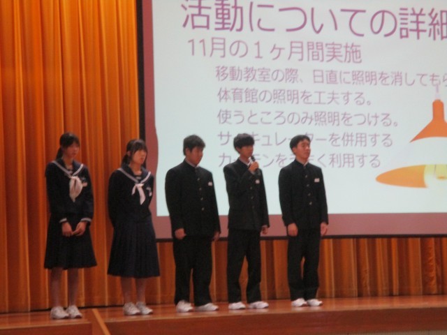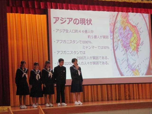 3年生の総合的な学習の時間の発表は、国際的な課題の解決に向けてのテーマでした。気候変動や貧困問題を取り上げ、その実態を発表し、自分たちにできることを提案していました。衣服の回収や募金に大勢の方が協力してくださいました。発表と呼びかけの効果に、生徒も嬉しい気持ちを味わっていました。