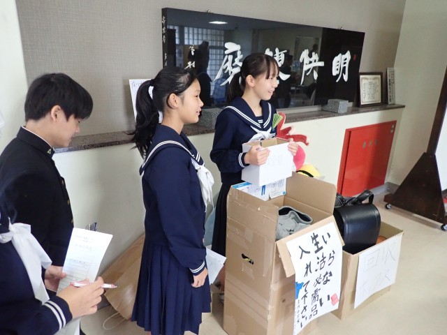 鑑賞等の時間に、3年生は衣服の回収や募金活動を行いました。これは、現在総合的な学習の時間で取り組んでいる「