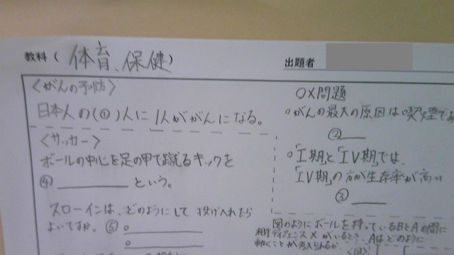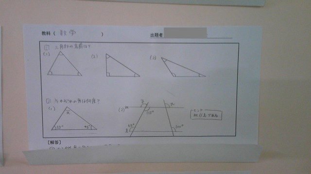 2年生の掲示板に「期末テスト予想問題」が貼り出されています。丁寧に書いて、仲間の役に立ちたい!という思いが伝わってきます。