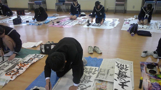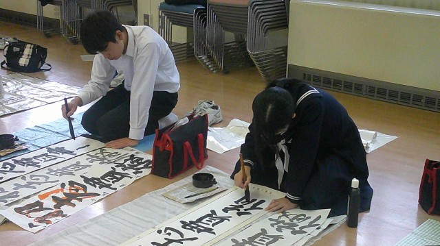 今日は外部講師の方をお迎えして、書初めの練習を見ていただく日です。手本をよく見て、字形を整えようと努力していました。講師の先生が一人一人にご助言くださり、生徒は粘り強く取り組んでいました。静けさの中に集中を感じるよい時間でした。