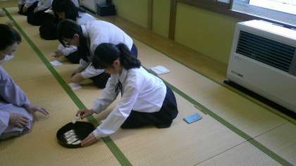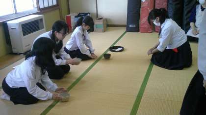 月曜日に実施している特設の「茶道クラブ」。興味関心のある生徒が集います。お菓子をいただく、畳の上を歩く、などの基本動作が美しくなってきます。おいしいお菓子とお抹茶をいただける楽しみもあります。取り組んでいる庄中生から、習得する喜びを感じます。