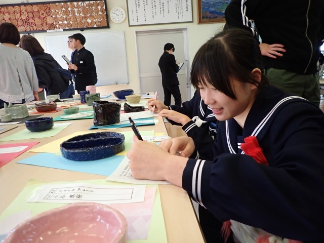 午前中の鑑賞の時間では、生徒たちは学年や美術部の展示物等を鑑賞しました。カードに気になった作品の感想を書きながら、じっくりと鑑賞していました。