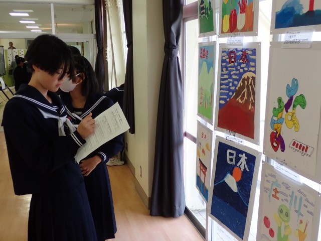 国際社会の中で私たちができること」を学習発表会で実現しようとした取組です。生徒たちは国際社会に貢献できるように熱心に活動していました。