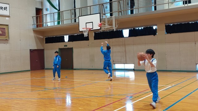 1年生が保健体育の時間にバスケットボールを学習しています。基本的な技術を身に付ける時間で、ランニングシュートの練習をしていました。仲間からもらったボールをリズムよく運びゴールを狙います。