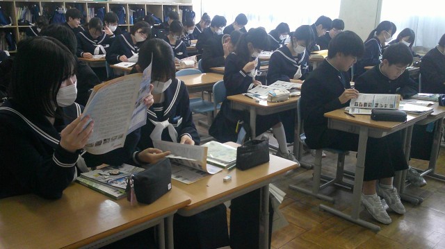 2年生が県立高等学校について書かれている資料をもらっていました。「ねえ、どこの高校に行きたい?」「こんな学科があるんだ!」「いとこが福野高校はいいよって言ってた」など、いろいろな会話が飛び交っていました。自分の人生を考える時間、大切です。