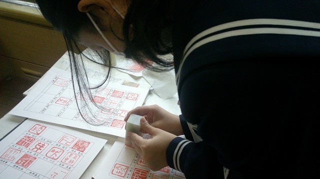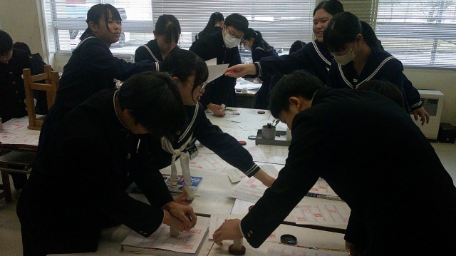 3年生が美術の時間に篆刻に取り組んでいます。仕上がった生徒たちが、互いにシートに押印していました。デザインが凝っている作品、彫りが丁寧な作品と、個性が出ています。卒業の記念作品となりました。