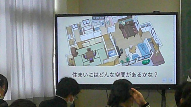 2年生が家庭科で住居に関する学習をしています。個の空間や共同の空間に分け、自分の生活と結び付けて考えました。先生の「一番好きな空間はどこですか?」という問いかけに、「お風呂」「トイレ」などの回答がありました。笑顔の時間でした。