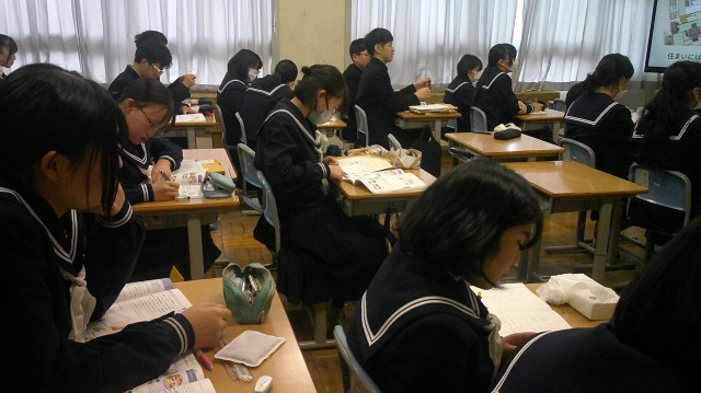 2年生が県立高等学校について書かれている資料をもらっていました。「ねえ、どこの高校に行きたい?」「こんな学科があるんだ!」「いとこが福野高校はいいよって言ってた」など、いろいろな会話が飛び交っていました。自分の人生を考える時間、大切です。