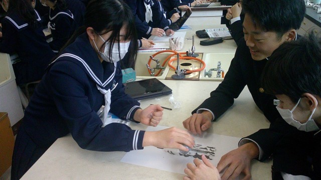 2年生が理科の時間に実験をしていました。紙の上に棒磁石を置き、上から砂鉄をかけます。目には見えない磁力の世界が模様となって現れる不思議。「おお~」という歓声があがりました。方位磁石を置き、SとNがどうなるかも調べました。実験が興味・関心をさらに高めた時間でした。