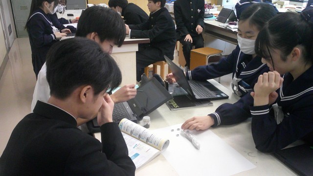3年生の理科の時間。カーボンニュートラルについて、情報を収集、整理し、考える時間でした。資料集やインターネットなど、いろいろなところから情報収集した生徒たち。「人が住む近くでは、原子力発電は危険なのではないか」「水力発電は、莫大な予算をかけて発電施設を設置しなければならない。環境への問題もある」と、整理した資料から、いろいろなことを読み取って、考えていました。