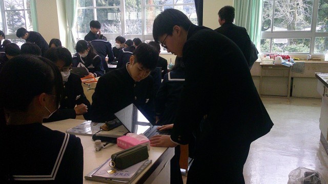2月19日より、1,2年生の期末考査が始まります。1年生の数学では「立方体の体積の求め方を復習しよう」と、問題に挑戦しました。学んだことを総動員し、問題にかじりつきました。分からない問題や、理解が不十分なところは、教え合い、助け合い、です。「ねえ、ここ教えて」「どうしてこうなるの」と互いに聞き合う生徒。理解が進むと、「は~ん、なるほど」「わかったよ、ありがとう」という言葉が飛び交います。