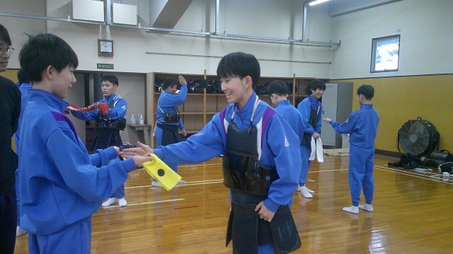 1年生の保健体育では、剣道の学習をしています。胴を付けることも、ずいぶん短い時間でできるようになりました。基本動作と共に、面、小手、胴と、いった技を出すことも教わり、稽古してきました。今日は、相手が1つの技を出そうとするときには、どこか空いたところができ、そこをねらうことを教わりました。難しいことですが、武道の面白さでもあります。演示してくれた剣道部の生徒が、日頃がんばっていることをちょっぴり理解できた、と話してくれた生徒がいます。道は深いです。