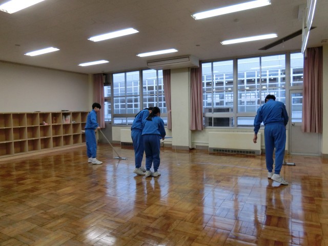 教室の床の汚れをみんなできれいに落としたあと、環境・ボランティア委員会がワックスをかけました。