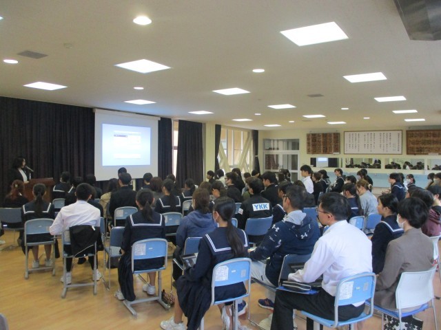 来月卒業を控えた3学年で「生き方に学ぶ講演会」を開催しました。講師には㈱就活ラジオ代表取締役 碓井一平先生をお招きし、起業家としての考え方や体験談をお話いただきました。「自分のやりたい事に本気で向き合う」「とりあえず挑戦する」「環境が人を育てる」「飛び出した先にあるのは自分のものさし」等の言葉は、新しいステージを選択して飛び立とうとする3年生に大きなエールとして心に響いたと思います。この学びを生かして、一人一人が夢や目標をもって自分の人生を切り拓いていってほしいと思います。 -