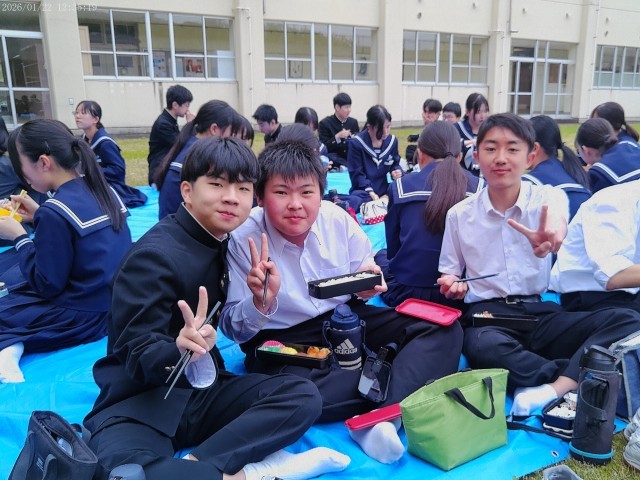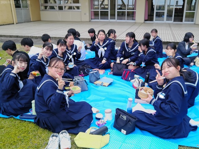 3学年の今日のお昼ごはんは青空ランチでした。去年も中庭で食べたことがあり、準備も慣れたもの。マイレジャーシート持参の生徒もいました。春の陽気に包まれて、外で味わうお弁当は格別でした。
