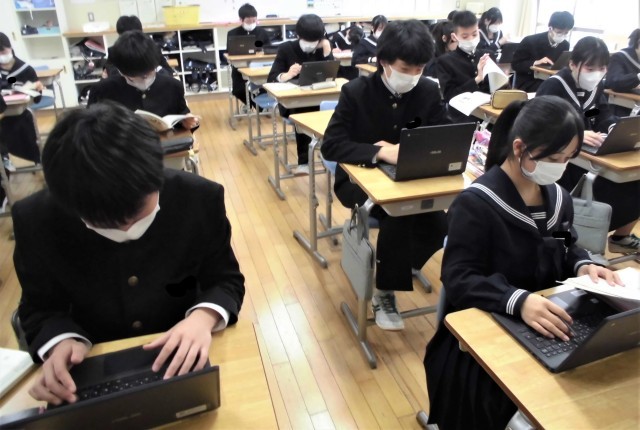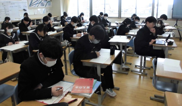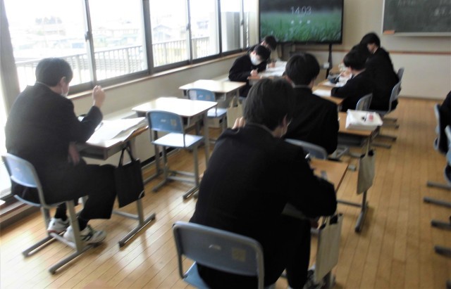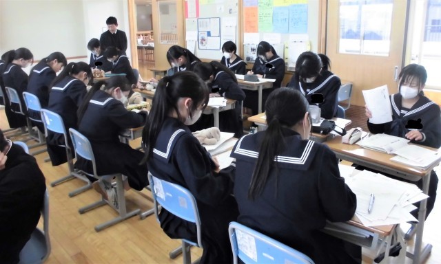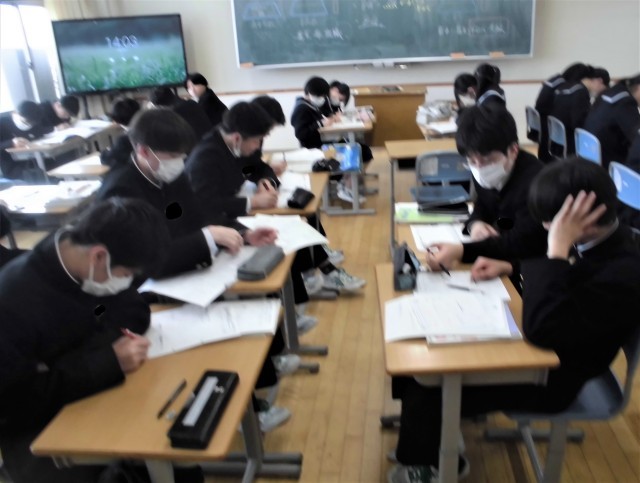 3年生の数学科です。過去の入試問題に取り組んでいます。先生に聞いたり、教え合ったりしています。県立高校の一般入試は3月5日(木)、6日(金)です。頑張れ3年生!
