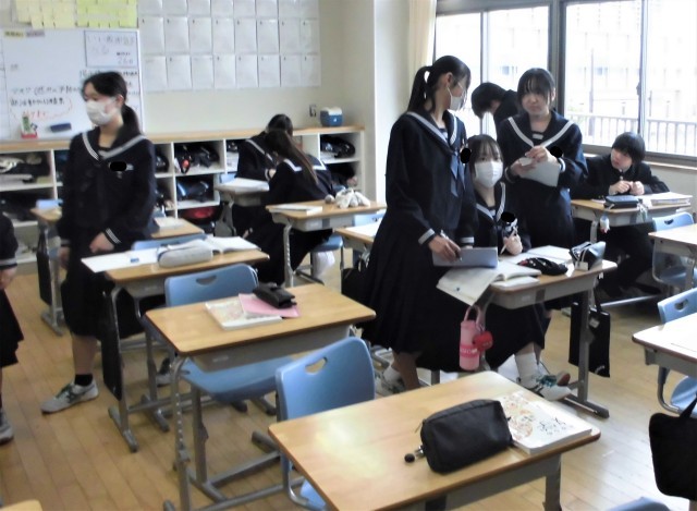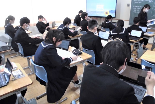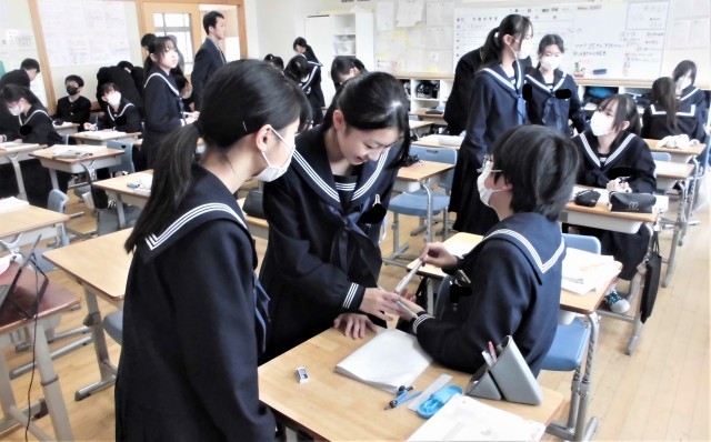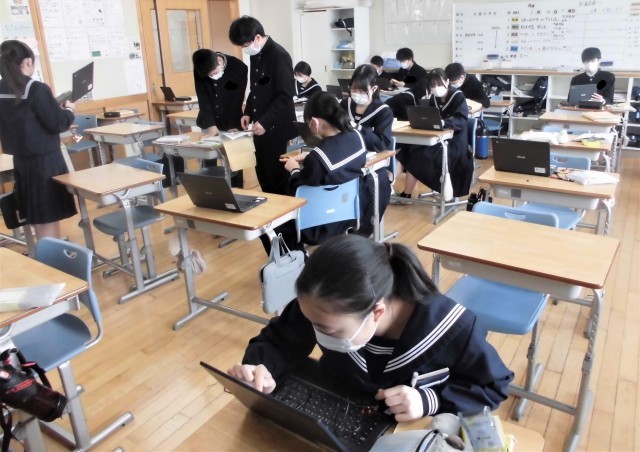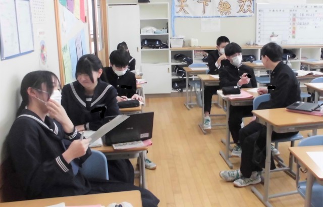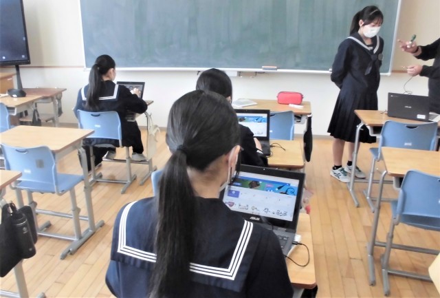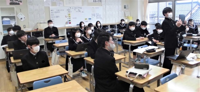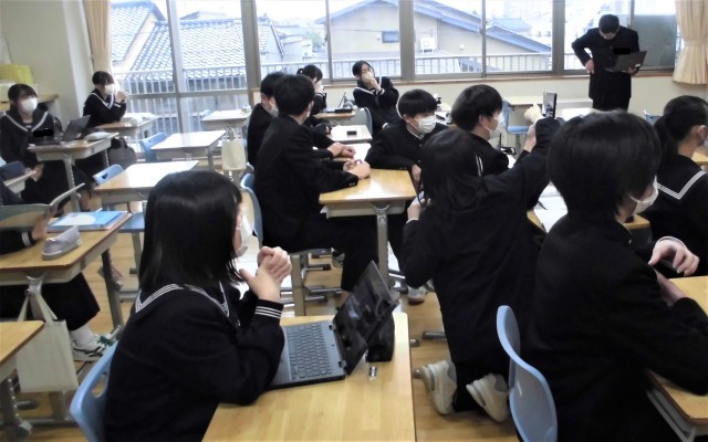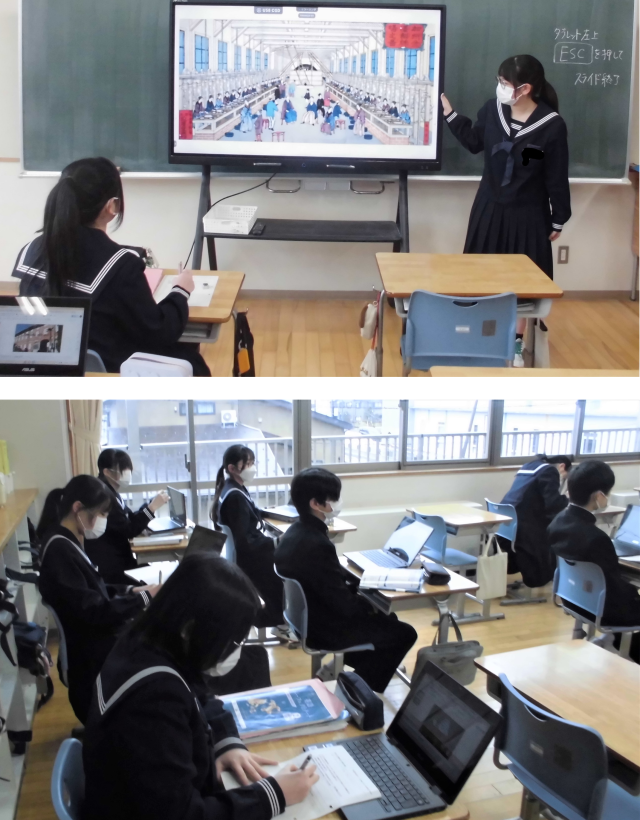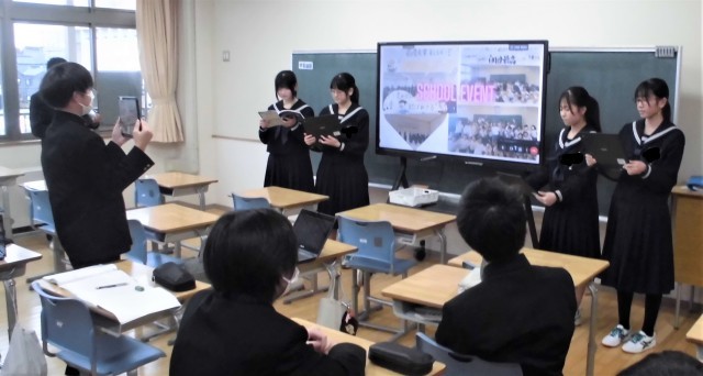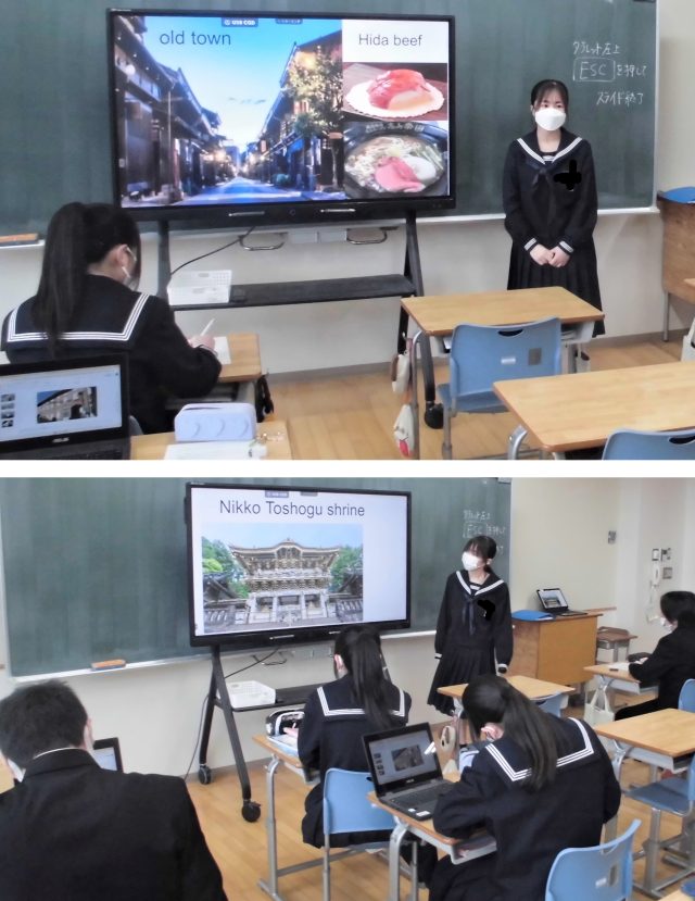 2年生の英語科です。「ALTに日本の観光名所を紹介しよう」という言語活動で学習を進めています。今日は、個人で作成した観光名所のプレゼンを英語で発表していました。みんな集中して発表を聴いていました。