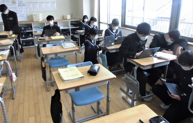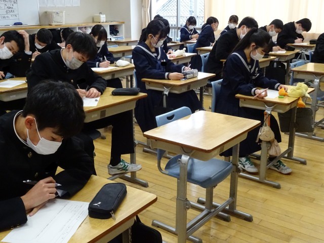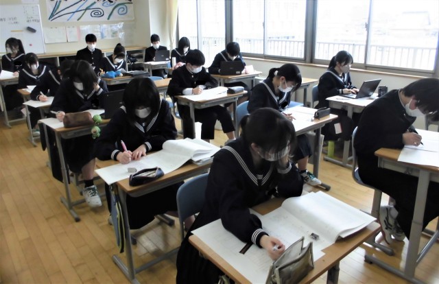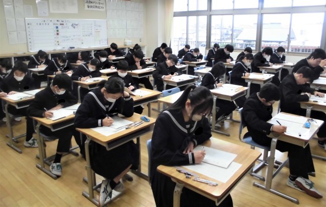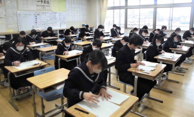 3年生は卒業まであと14日となりました。写真は理科の授業ですが、どの教室も入試に向けて、あるいは高校入学後を見据えて、これまでの学習の復習をしています。