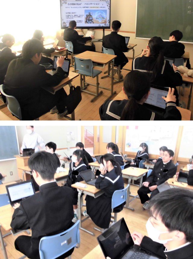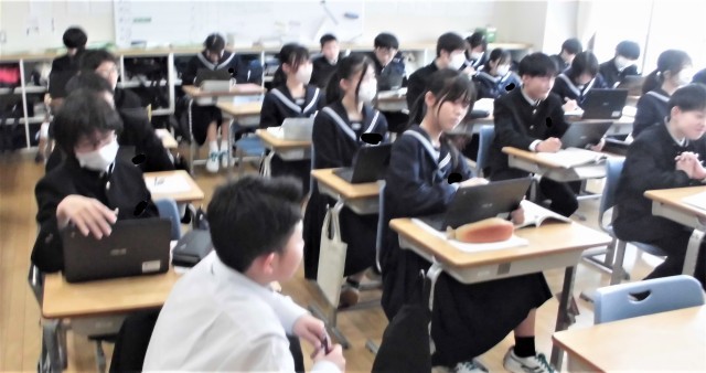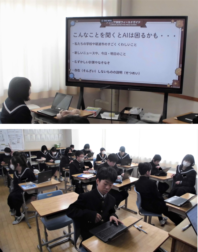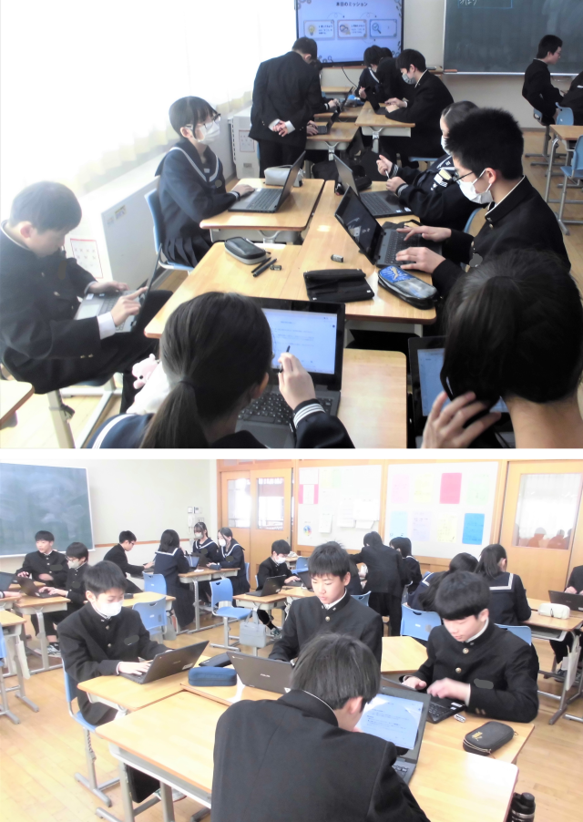 1年生の「生成AI導入前の授業」4学級の様子です。授業では、生成AIの仕組み、生成AIの情報は全て正しいのではないということ、生成AIを活用するときの約束などについて学びました。生徒は集中して学習に取り組んでいました。
