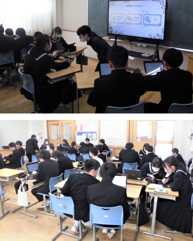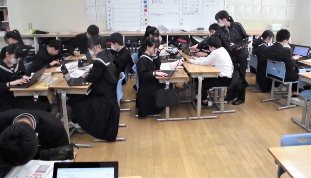 1年生の社会科です。「ヨーロッパの文化や社会はイスラム商人との交流によってどのように変化したか」という課題で学習を進めています。生徒は課題について自分で資料を活用し、課題に対する考えをまとめています。