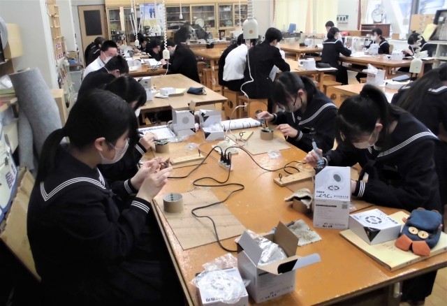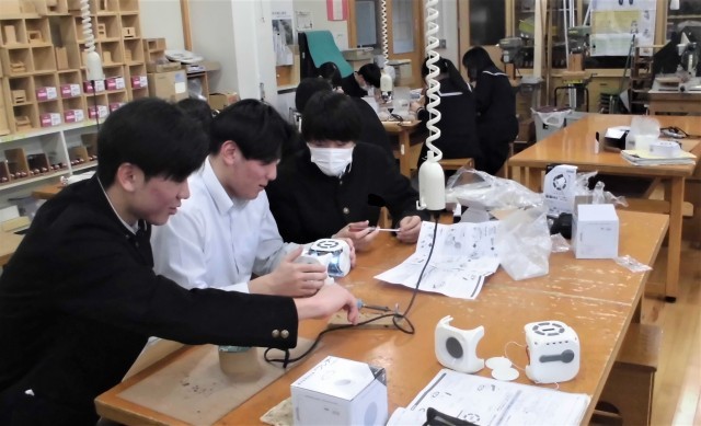 3年生の技術科です。ダイナモラジオをつくっています。生徒ははんだごてを使って基盤に接続する作業を集中して行っています。ほぼ完成に近づいています。