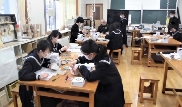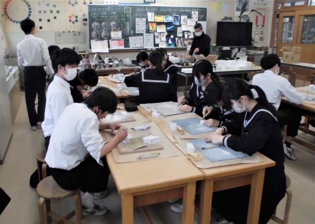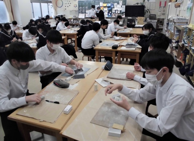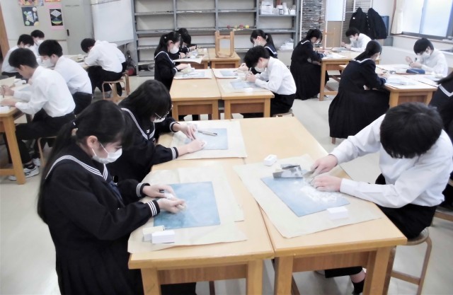 2年生の美術科では、「自分だけの印鑑をつくろう!」を課題として、石材を彫刻刀で削って印鑑をつくっています。生徒は自分のお気に入りの印鑑にするため、一生懸命に石材を削っています。なかなか根気のいる作業に集中して取り組んでいる生徒たちです。完成が楽しみですね。