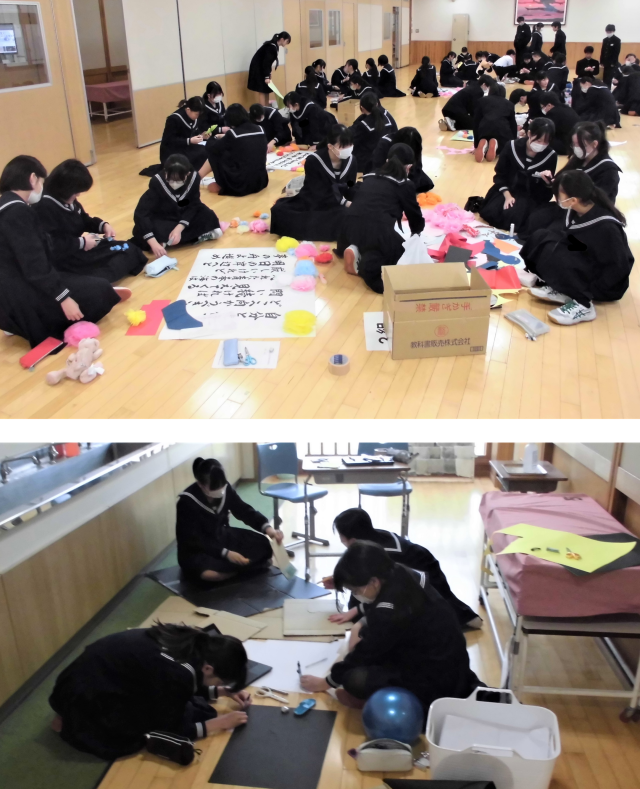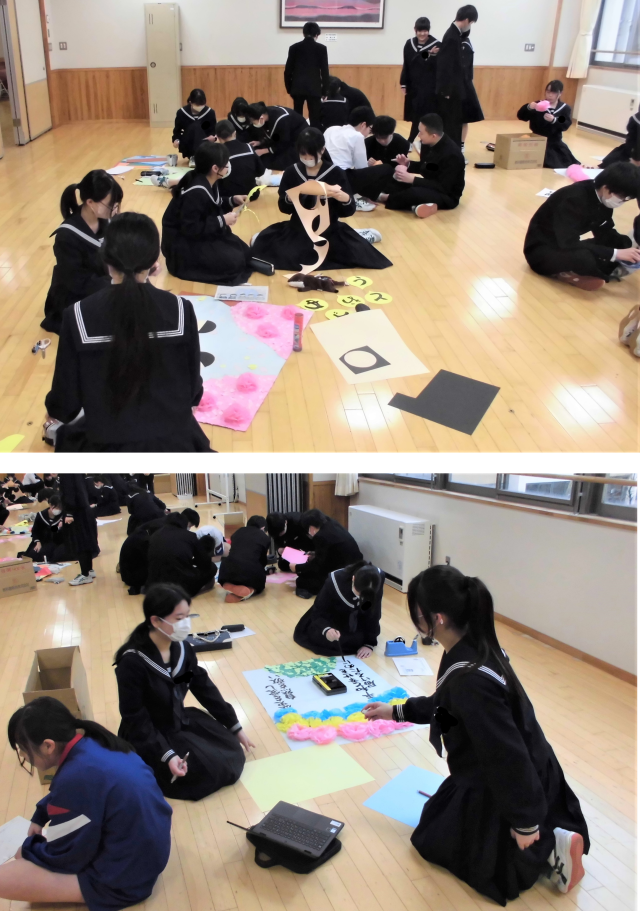 今日の午後、1年生が予餞会の準備をしました。3年生の先輩に感謝の気持ちを伝えようと、自分たちで考えて活動を行っています。