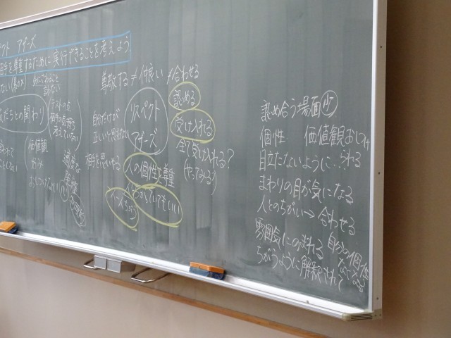 相手の人格や個性を肯定的に受け止めることが真の「リスペクト」だと気付いた生徒もいるなど、生徒一人一人が安心して過ごせるために必要なことを学びました。