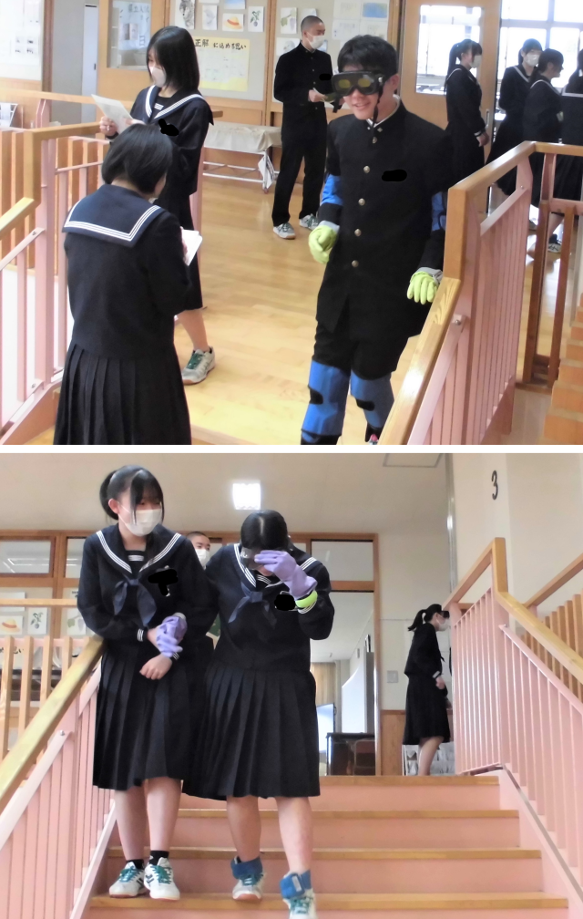 3年生の家庭科です。「高齢者との接し方について考えよう」をテーマに学習を進めています。高齢者の身体的な変化を体験しました。その体験を参考にしたり、資料を活用したりして、高齢者との接し方について自分の考えをまとめました。