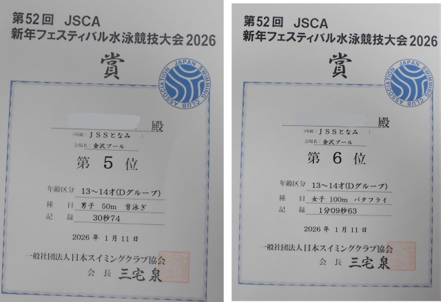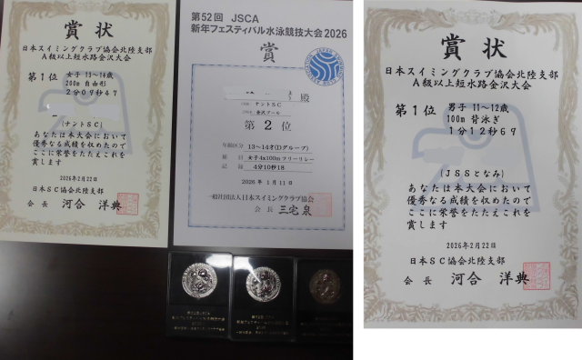 受賞報告です。特設水泳部の生徒が、日本スイミングクラブ協会北陸支部A級以上短水路金沢大会(2月開催)、第52回JSCA新年フェステイバル水泳競技大会2026(1月開催)の結果を報告してくれました。この生徒たちは、ナントSC、JSSとなみという地域クラブで一生懸命に練習に励んでいる生徒たちです。この2つの大会では、複数の種目で1位や上位の成績を残した生徒もいます。写真の賞状は、本人たちが最も価値があると考えた賞状をアップしました。これからも頑張ってください!