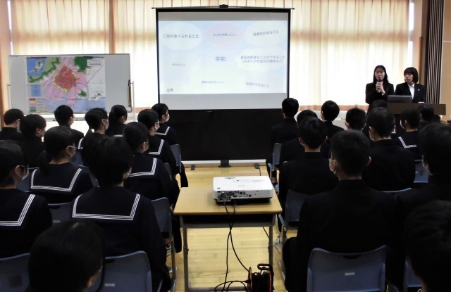 2年生の修学旅行事前学習「平和に関する講演会」の様子です。写真は、大学生の竹本さん、小林さんの平和に関するお話と平和をどのように感じているか生徒が考え、代表が発表している場面です。