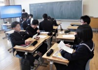 2年生の社会科の授業では、「江戸時代の前半にはどのような文化が発展したのか」という学習課題のもと、元禄文化について、文学、美術、学問、暮らしの様々な事柄から、自分の調べたことを発表しました。黒板には、生徒のネームカードがあります。生徒は、課題に真剣に取り組んでいました。