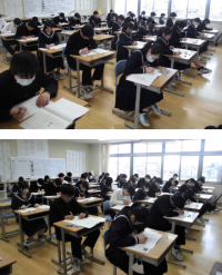 1学期もあと3日で終わります。3年生の数学科の授業では、教科書やワーク等の学習問題に、生徒が共に教え合い、学び合いながら取り組んでいました。入試問題はとても難解です。分からないことを少しでも分かるようになりたいという気持ちが伝わってきます。