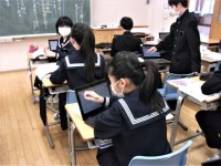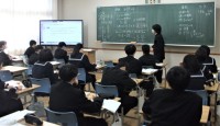 1年生の数学科の授業です。データの活用単元で、「A年度とB年度ではどちらの結果が優れているか」という学習課題に取り組んでいます。今回活用したデータのように代表値に違いがないときは、度数分布表やヒストグラフを使った方が比較しやすいということに気付いた生徒たちです。この授業は、昨日の研究授業と同じ内容となっています。