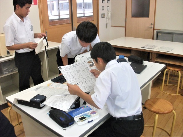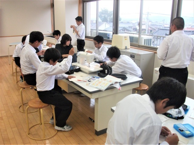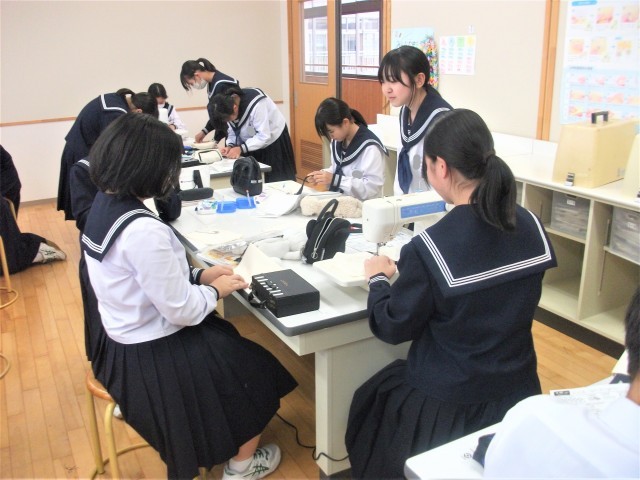 1年生の家庭科の授業では、「ポーチ」を作成しています。今日も、針と糸、ミシンを使ってポーチを作っていました。自分なりのポーチができるといいですね。