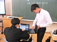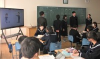 1年生の国語科の授業です。今日は、「文化祭の案内文を読み合い、よさ(工夫)を見つけよう」という言語活動を行い、案内文の書き方について再確認しました。タブレット端末で、互いの意見を交流しています。